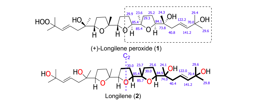 The red seaweed Laurencia viridis is a rich source of oxygenated secondary metabolites that were derived from squalene. We report here the structures of three novel compounds, (+)-longilene peroxide (1), longilene (2), and (+)-prelongilene (3) that were isolated from this alga, in addition to other substances, 4 and 5, resulting from their acid-mediated degradation. The effect of compounds 1 and 3 against Ser-Thr protein phosphatase type 2A (PP2A) was evaluated, showing that (+)-longilene peroxide (1) inhibited PP2A (IC 11.3 µM). In order to explain the interaction between PP2A and compounds 1 and 3, molecular docking simulations onto the PP2A enzyme-binding region were used.