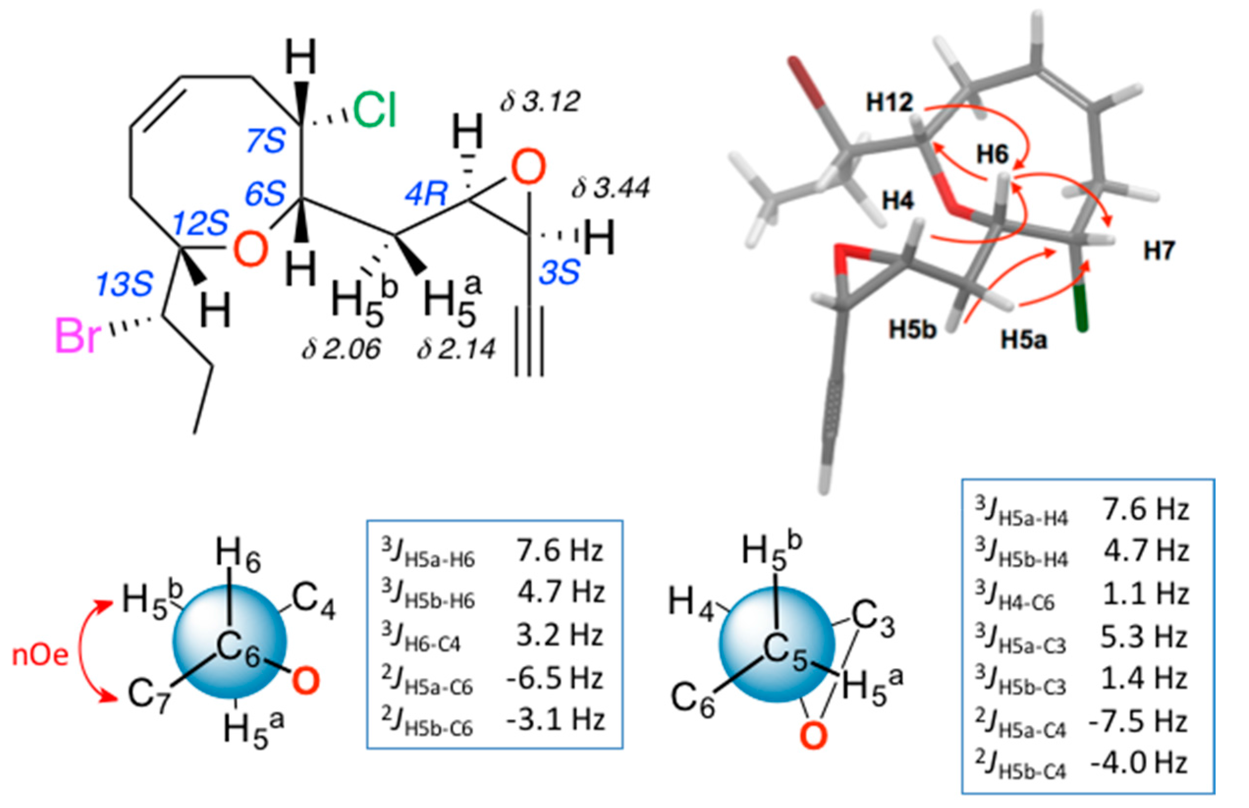 Red algae of Laurencia continue to provide wide structural diversity and complexity of halogenated C acetogenin medium-ring ethers. Here, we described the isolation of three new C acetogenins (3–5), and one truncated derivative (6) from Laurencia viridis collected on the Canary Islands. These compounds are interesting variations on the pinnatifidenyne structure that included the first examples of ethynyl oxirane derivatives (3–4). The structures were elucidated by extensive study of NMR (Nuclear Magnetic Resonance) data, J-based configuration analysis and DFT (Density Functional Theory) calculations. Their antiproliferative activity against six human solid tumor cell lines was evaluated.