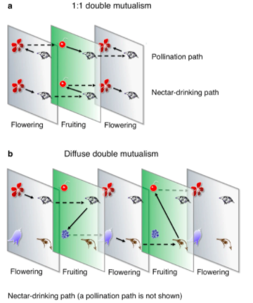 Life on oceanic islands deviate in many ways from that on the mainland. Their biodiversity is relatively poor and some groups are well-represented, others not, especially not insects. A scarcity of insects forces birds to explore alternative food, such as nectar and fruit. In this way, island birds may pollinate and disperse seed to an extent unseen on any mainland; they may even first consume floral resources of a plant species and then later harvest the fruit of the same species. Through this biotic reuse, they may act as double mutualists. The latter have never been studied at the level of the network, because they are traditionally considered rare. We sampled pollination and seed-dispersal interactions on Galápagos and constructed a plant-bird mutualism network of 108 plant (12% being double mutualists) and 21 bird species (48% being double mutualists), and their 479 interactions, being either single (95%) or double mutualisms (5%). Double mutualists constitute the core in the pollination-dispersal network, coupling the two link types together. They may also initiate positive feedbacks (more pollination leading to more dispersal), which theoretically are known to be unstable. Thus, double mutualisms may be a necessary, but risky prerequisite to the survival of island biodiversity.