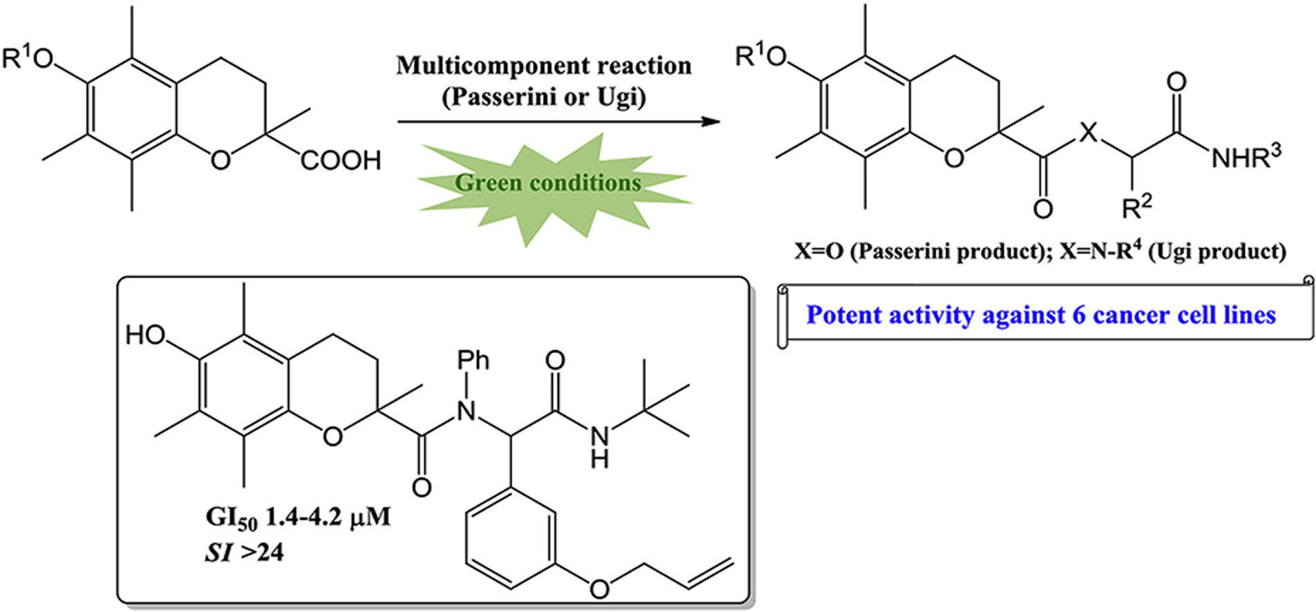 A one-pot efficient, practical and eco-friendly synthesis of tocopherol analogues has been developed using water or solvent free conditions via Passerini and Ugi multicomponent reactions. These reactions can be optimized using microwave irradiation or ultrasound as the energy source. Accordingly, a small library of 30 compounds was prepared for biological tests. The evaluation of the antiproliferative activity in the human solid tumor cell lines A549 (lung), HBL-100 (breast), HeLa (cervix), SW1573 (lung), T-47D (breast), and WiDr (colon) provided lead compounds with GI values between 1 and 5 μM. A structure–activity relationship is also discussed. One of the studied compounds comes up as a future candidate for the development of potent tocopherol-mimetic therapeutic agents for cancer.