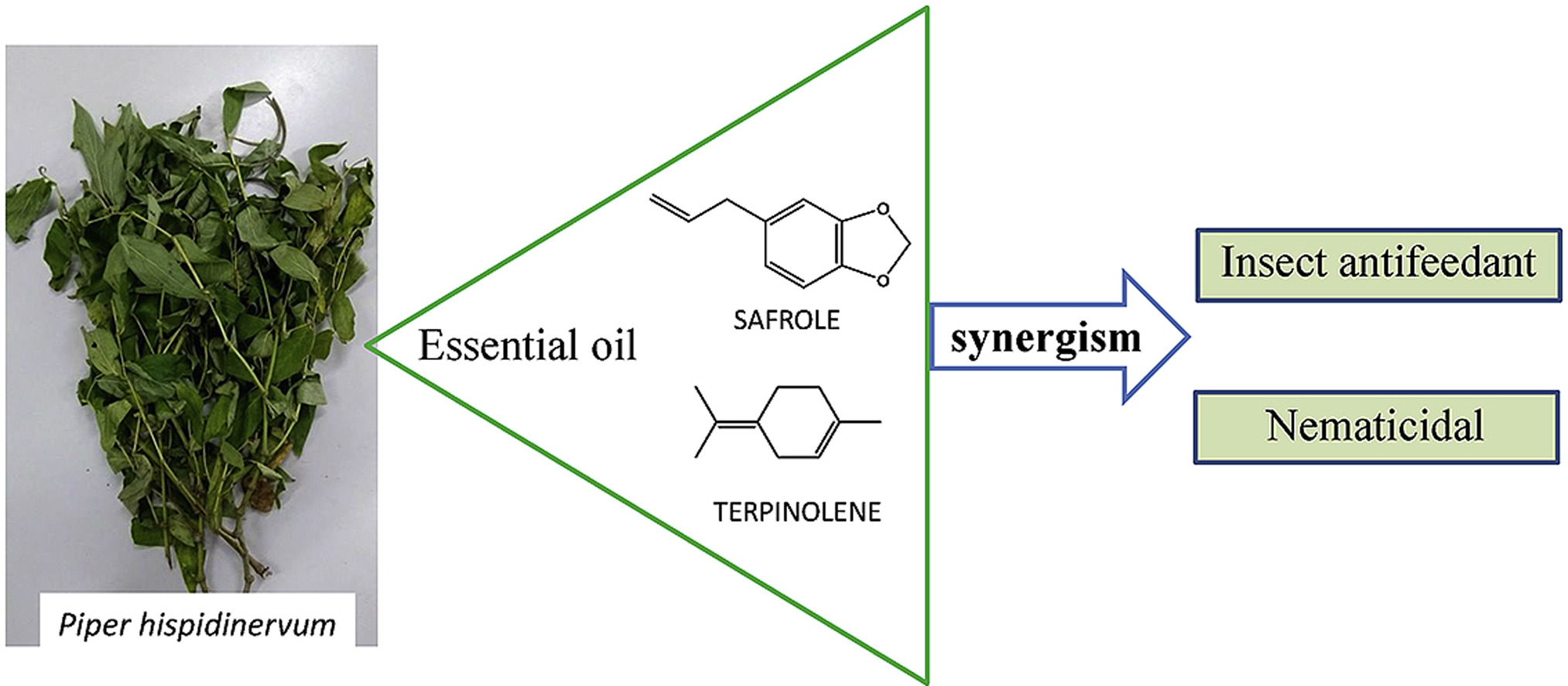 In this study we evaluated the effect of a pressure gradient (1–2 atm) in the extraction and composition of the essential oil (EO) of Piper hispidinervum by steam distillation. We also evaluated the insect antifeedant effects (Spodoptera littoralis, Leptinotarsa decemlineata, Myzus persicae and Rhopalosiphum padi) and nematicidal activity (Meloidogyne javanica) of the oils, their major components and their synergistic interactions. Safrole was the major component (78–81%) followed by terpinolene (5–9%). The EOs tested were effective insect antifeedants. Safrole, explained most of the insect antifeedant action of P. hispidinervum EOs. When safrole and terpinolene were tested in binary combinations, low ratios of safrole improved the antifeedant effects of terpinolene. P. hispidinervum EOs caused higher mortality of M. javanica juveniles than their major components. In binary combinations, low ratios of terpinolene increased the nematicidal effects of safrole. The EO treatment strongly suppressed nematode egg hatching and juvenile infectivity. P. hispidinervum EOs affected the germination of S. lycopersicum and L. sativa mostly at 24 h of treatment, being L. sativa the most sensitive. Safrole moderately affected germination and root growth of L. sativa, S. lycopersicum and L. perenne. Terpinolene only affected S. lycopersicum root growth.