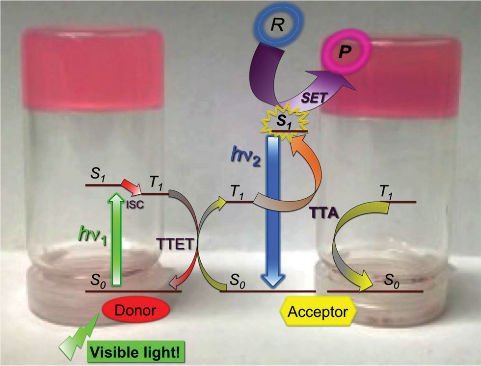 Self-assembled supramolecular gels have recently emerged as promising confined media for the incorporation of a wide range of donor–acceptor chromophoric assemblies, allowing highly efficient photon upconversion processes at weak solar irradiance even under aerobic conditions in some cases. Supramolecular gels made of dense intermo-lecular interaction networks such as hydrogen bonding have been demonstrated to offer effective protection to the excited species against oxygen quenching. This supramolecular approach is reminiscent to biological photon-harvesting systems and constitutes a new paradigm in photon upconversion research. This minireview summarizes the advances in this approach since its first report a few years ago. The possibility of carrying out photon upconversion in supramolecular gel matrices under aerobic conditions has also enabled to combine this process with a single electron transfer in order to carry out challenged chemical reactions such as the photoreduction of aryl halides in air using visible light. The main aspects of this combined strategy and future perspectives are also discussed.