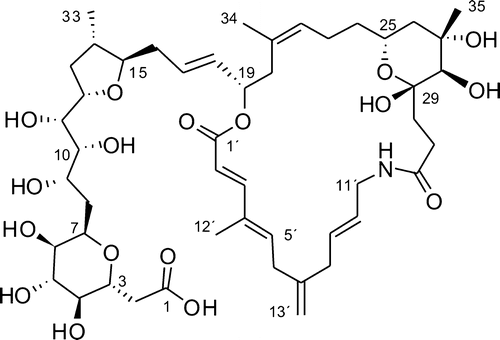 Belizentrin (1), a novel 25-membered polyketide-derived macrocycle, was isolated from cultures of the marine dinoflagellate Prorocentrum belizeanum. This metabolite is the first member of an unprecedented class of polyunsaturated and polyhydroxylated macrolactams. The structure of 1 was primarily determined by NMR and computational methods. Pharmacological assays with cerebellar cells showed that 1 produces important changes in neuronal network integrity at nanomolar concentrations.