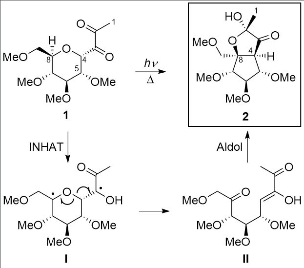 The excitation of the innermost carbonyl of nono‐2,3‐diulose derivatives by irradiation with visible‐light initiates a sequential Norrish type II photoelimination and aldol cyclization process that finally gives polyfunctionalized cyclopentitols. The rearrangement has been confirmed by the isolation of stable acyclic photoenol intermediates that can be independently cyclized by a thermal 5‐(enolexo)‐exo‐trig uncatalyzed aldol reaction with high diastereoselectivity. In this last step, the large deuterium kinetic isotope effect found for the 1,5‐hydrogen atom transfer seems to indicate that the aldol reaction runs through a concerted pericyclic mechanism. Owing to the ready availability of pyranose sugars of various configurations, this protocol has been used to study the influence of pyranose ring‐substituents on the diastereoselectivity of the aldol cyclization reaction. In contrast with other pyranose ring contraction methodologies no transition‐metal reagents are needed and the sequential rearrangement occurs simply by using visible light and moderate heating (0 to 60 °C).