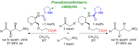Otro de los modelos elegidos para el estudio de las interacciones no-covalentes son los péptidos miméticos cuyo objetivo es imitar la estructura peptídica disponiendo espacialmente los grupos funcionales de forma controlada. Al poseer características semejantes a sus homólogos naturales, se han utilizado para reemplazar a las enzimas o proteínas, o para interrumpir las interacciones entre proteínas. Nosotros hemos utilizados los azúcares-aminoácidos (SAA) como unidad estructural para la construcción de péptido-miméticos. Estas unidades contienen el esqueleto de un azúcar, y a su vez poseen un grupo amino y otro ácido. Estudiando los péptidos cíclicos provenientes de los ε-SAA, encontramos que pequeños cambios en el esqueleto del ε-SAA modifican de forma notable la disposición espacial de los macrociclos, debido a que se transforma el patrón de las interacciones no-covalentes intramoleculares. Trasladando este conocimiento a la organocatálisis hemos diseñado dos catalizadores pseudoenantiomericos capaces de catalizar adiciones de Michael de aldehídos a β-nitroestirenos de forma enantioselectiva utilizando cargas catalíticas menores del 1 mol %, con rendimientos prácticamente cuantitativos y excesos enantioméricos superiores al 97 %.