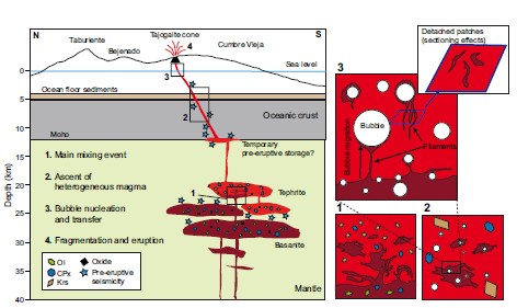 Syneruptive magma mixing is widespread in volcanic eruptions, affecting explosivity and composition of products, but its evidence in basaltic systems is usually cryptic. Here we report direct evidence of mixing between basanitic and tephritic magmas in the first days of the 2021 Tajogaite eruption of Cumbre Vieja, La Palma. Groundmass glass in tephritic tephra from the fifth day of the eruption is locally inhomogeneous, showing micron-scale filamentary structures of Si-poor and Fe-, Mg-rich melt, forming complex filaments attached to bubbles. Their compositional distribution attests the presence of primitive basanitic magma, with compositions similar to late-erupted melts, interacting with an evolved tephritic melt during the first week of the event. From filament morphology, we suggest their generation by dragging and folding of basanitic melt during bubble migration through melt interfaces. Semi-quantitative diffusion modelling indicates that the filamentary structures are short-lived, dissipating in timescales of tens of seconds. In combination with thermobarometric constraints, we suggest a mixing onset by sub-Moho remobilization of a tephritic reservoir by basanite input, followed by turbulent ascent of a mingled magma. In the shallow conduit or lava fountain, bubble nucleation and migration triggered further mingling of the distinct melt-phases. This phenomenon might have enhanced the explosive behaviour of the eruption in such period, where violent strombolian explosions were common.
