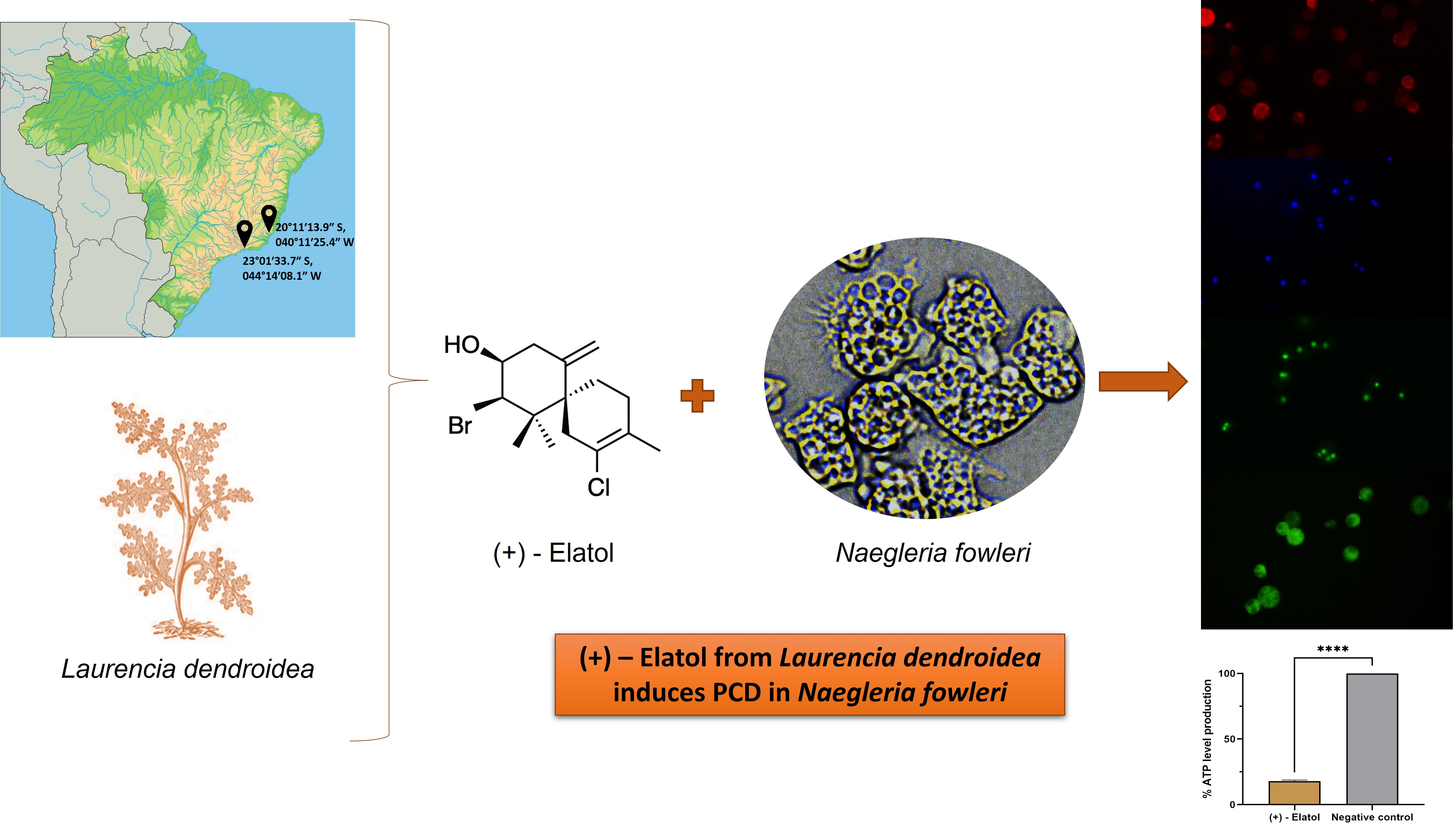 Naegleria fowleri is an opportunistic protozoon that can be found in warm water bodies. It is the causative agent of the primary amoebic meningoencephalitis. Focused on our interest to develop promising lead structures for the development of antiparasitic agents, this study was aimed at identifying new anti-Naegleria marine natural products from a collection of chamigrane-type sesquiterpenes with structural variety in the levels of saturation, halogenation and oxygenation isolated from Laurencia dendroidea. (+)-Elatol (1) was the most active compound against Naegleria fowleri trophozoites with IC50 values of 1.08 μM against the ATCC 30808™ strain and 1.14 μM against the ATCC 30215™ strain. Furthermore, the activity of (+)-elatol (1) against the resistant stage of N. fowleri was also assessed, showing great cysticidal properties with a very similar IC50 value (1.14 µM) to the one obtained for the trophozoite stage. Moreover, at low concentrations (+)-elatol (1) showed no toxic effect towards murine macrophages and could induce the appearance of different cellular events related to the programmed cell death, such as an increase of the plasma membrane permeability, reactive oxygen species overproduction, mitochondrial malfunction or chromatin condensation. Its enantiomer (−)-elatol (2) was shown to be 34-fold less potent with an IC50 of 36.77 μM and 38.03 μM. An analysis of the structure–activity relationship suggests that dehalogenation leads to a significant decrease of activity. The lipophilic character of these compounds is an essential property to cross the blood-brain barrier, therefore they represent interesting chemical scaffolds to develop new drugs.