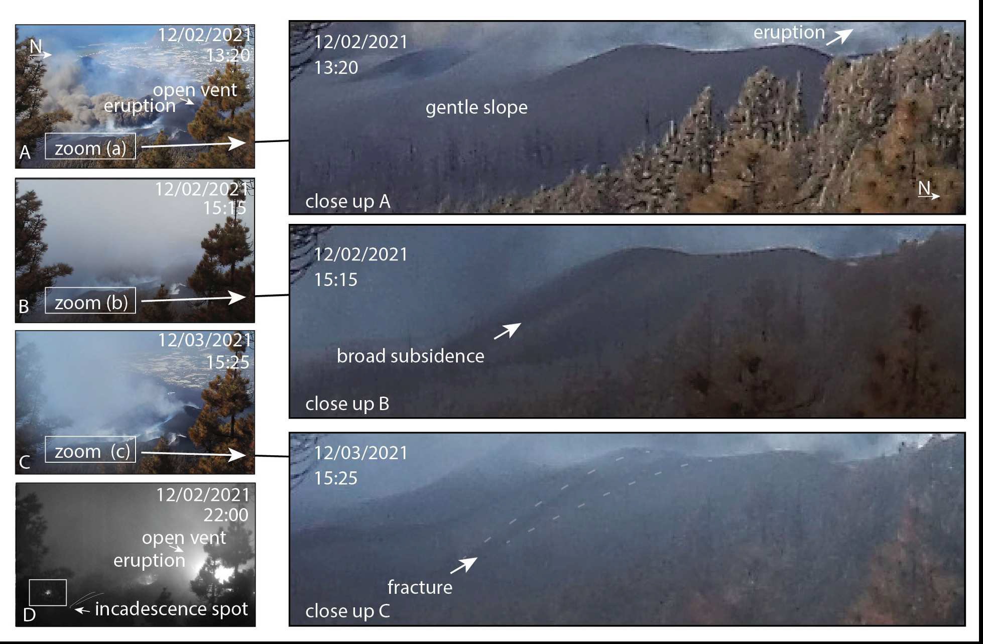 Volcanic eruptions are often preceded by episodes of inflation and emplacement of magma along tensile fractures. Here we study the 2021 Tajogaite-Cumbre Vieja eruption on La Palma, Canary Islands, and present evidence for tensile fractures dissecting the new cone during the terminal stage of the eruption. We use synthetic aperture radar (SAR) observations, together with drone images and time-lapse camera data, to determine the timing, scale and complexities associated with a fracturing event, which is diverging at a topographic ridge. By comparing the field dataset with analogue models, we further explore the details of lens-shaped fractures that are characteristic for faults diverging at topographic highs and converging at topographic lows. The observations made at Cumbre Vieja and in our models are transferrable to other volcanoes and add further evidence that topography is substantially affecting the geometry and complexity of fractures and magma pathways, and the locations of eruptions.