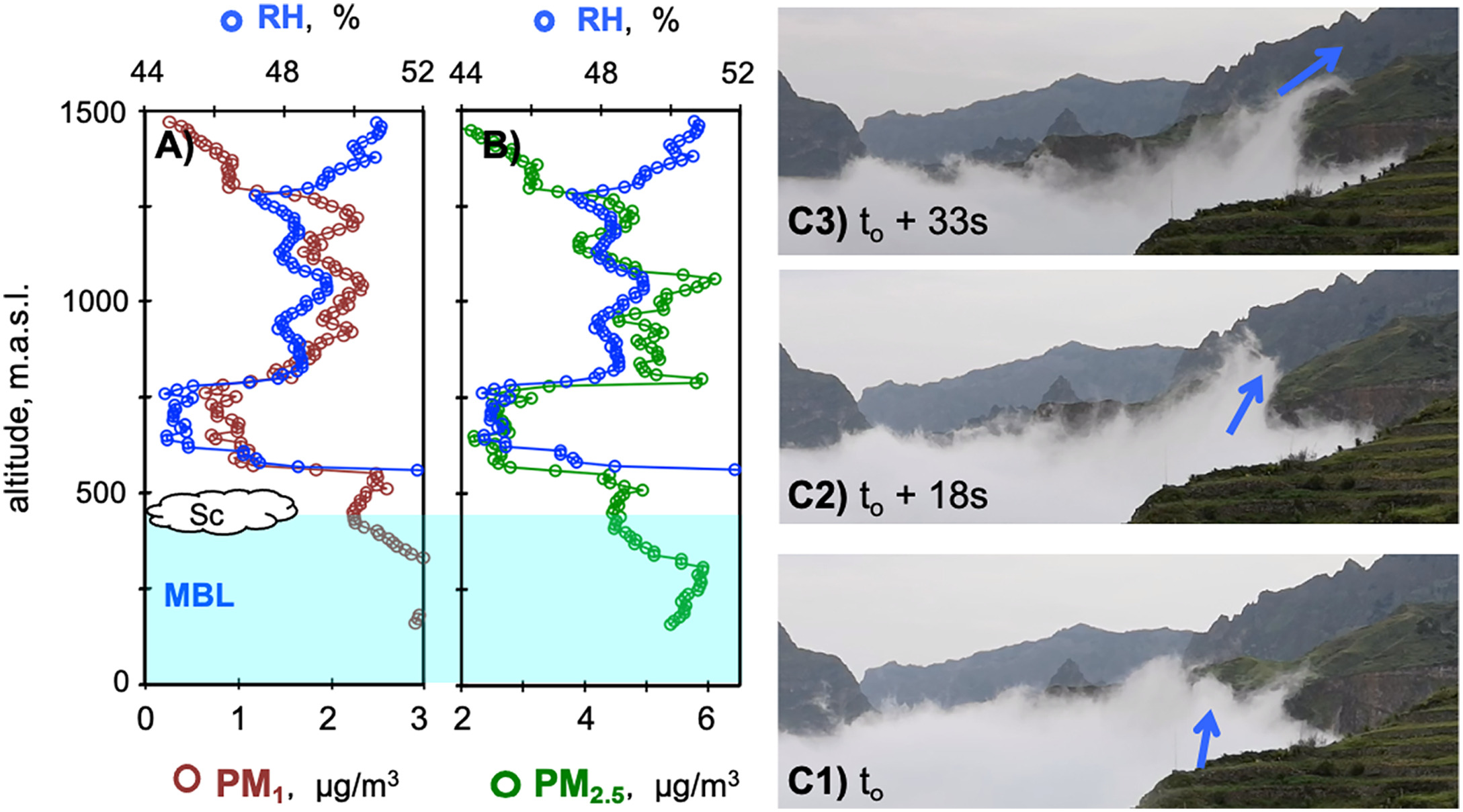 We investigated the sources and processes affecting the vertical distribution of tropical PMx aerosols (particulate matter -PM- smaller than 10, 2.5 and 1 μm, PM10, PM2.5 and PM1, respectively) in the low troposphere of Santo Antão and São Vicente islands, in Cape Verde archipelago, a region where a better understanding of aerosols is needed due to their involvement in tropical meteorology and their impact on air quality, ocean and climate. We found that local sources had a low-scale impact. From transect measurements at ground level, we found that PMx levels were predominantly low, except near to PMx sources, where distinctive PM1 / PM2.5 ratios were measured, linked to vehicle exhaust (0.96), biomass burning (0.67) and Cape Verdean dust (0.36) emissions. The depth of the marine boundary layer (MBL) and the vertical distributions of PMx showed wide variability prompted by meteorological conditions. The trade winds prevailed in the MBL, whereas other airflows were situated above it: North-Atlantic, African easterly airflow and Saharan Air Layer. Under North-Atlantic airflow conditions, the MBL extended to 1400 m above sea level (m.a.s.l.). Above this altitude, PMx concentrations decreased quickly (< 3 μg/m3) due to the free troposphere conditions. Under Saharan dust conditions, the MBL was confined to just 70 m.a.s.l., whereas a complex dust stratification was observed above, characterized by alternating dry air layers with high dust loads (PM10 ~ 100 μg/m3) and more humid air layers with lower aerosol loads (PM10 ~ 40 μg/m3). Within the dry easterly African airflow occurring above the marine stratocumulus typical of the MBL top (placed at 500 m.a.s.l.), we detected layers enriched in hydrophilic aerosols (PM10: ~ 8 μg/m3). These were imbedded in relatively humid air (RH ~48%), probably linked to secondary aerosol formation by in-cloud processes in the marine stratocumulus situated below. We found that PMx transport from North Africa, both under dust and dust-free conditions, is associated with complex vertical stratifications, even within the dusty Saharan Air Layer.