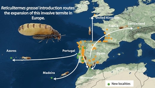 Despite providing important ecosystem services, termites are also serious pests of wooden structures. Termites are highly adaptive organisms that cause concern as an invasive species. Predictions of the future spread of their distribution range due to factors such as climate change, urban growth, and global trade present new challenges to our capacity to protect our wood and wood-based materials and structures effectively. Reticulitermes grassei Clément, 1978 (Blattodea: Rhinotermitidae) is a subterranean termite native to the Iberian Peninsula and France, whose global distribution has widened over recent years. This article updates the distribution range of this species, confirming its identification in the Azores, Madeira, and Morocco through molecular analysis. The origin and consequences of these putative invasive populations are discussed in light of previously available data. The resulting network showed a highly structured base consisting of many haplotypes from the southern and southwestern Iberian Peninsula (Spain and Portugal), including those from Morocco (in natural landscapes) and Switzerland (in infrastructures). The more derived part of the network includes the haplotypes from southwest France, the northwest Iberian Peninsula, the United Kingdom, Azores, and Madeira, the last 3 being linked probably to human-mediated transportation events. The potential impacts of invasive subterranean termite populations expanding into new regions are concerning, especially in urban environments, and remain uncertain in natural areas. The challenges posed by these termites could be especially worrying in island ecosystems. Hence, it is crucial to implement early warning systems and monitoring programs in regions susceptible to subterranean termite invasions.